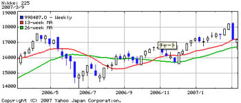 上の画像はライブドアショック時のヤフーの指標と日経225(日経平均)の指標です。
